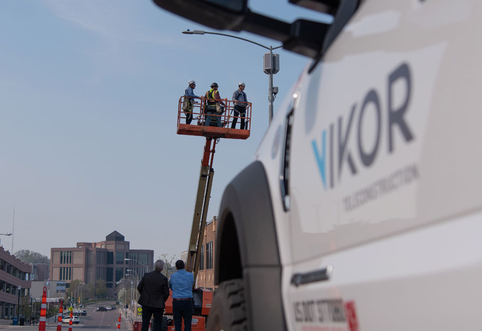 VIKOR staff met with FCC Commissioner Brendan Carr, Mayor TenHaken and Senator Thune's team to visit a 5G Small Cell site in downtown Sioux Falls, SD.